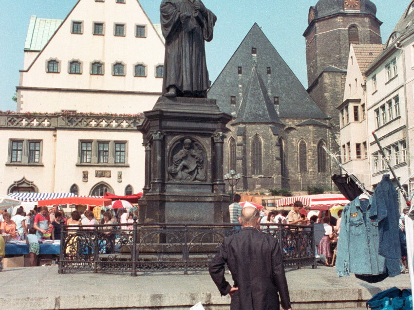 Dresden, 19.12.1989 Besuch von Bundeskanzler Kohl in Dresden Foto: Bundeskanzler Helmut Kohl bei seiner Rede vor der Frauenkirche