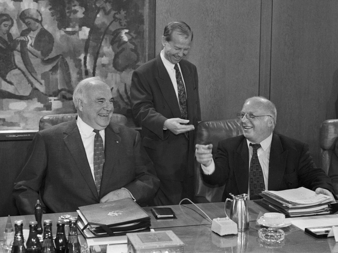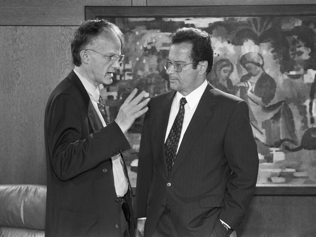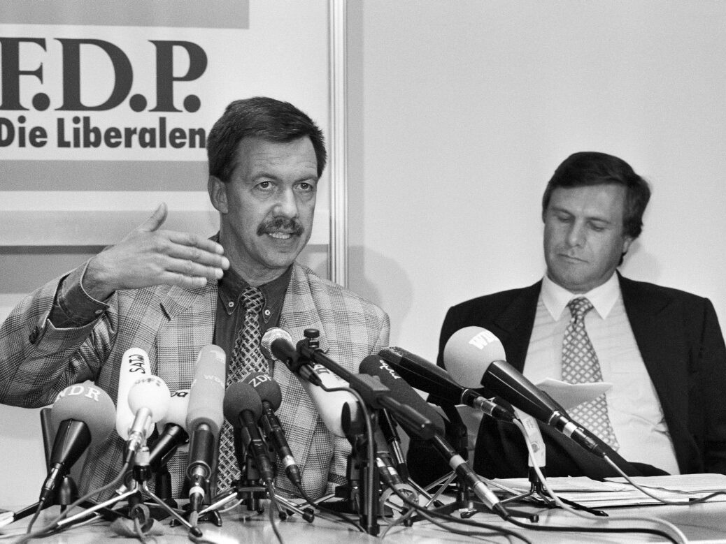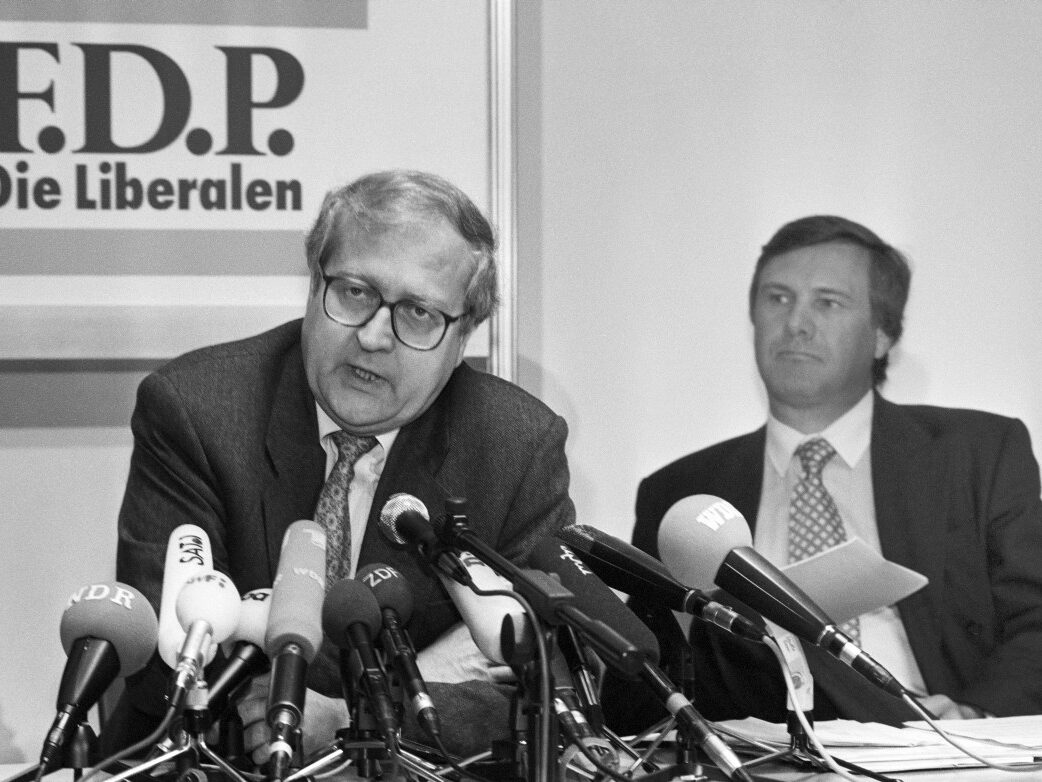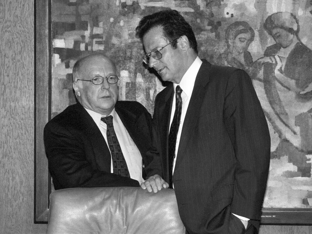 11.11.1989-Bonn Kabinettssitzung Foto: Otto Graf Lambsdorff im Gespräch mit Juergen Moellemann