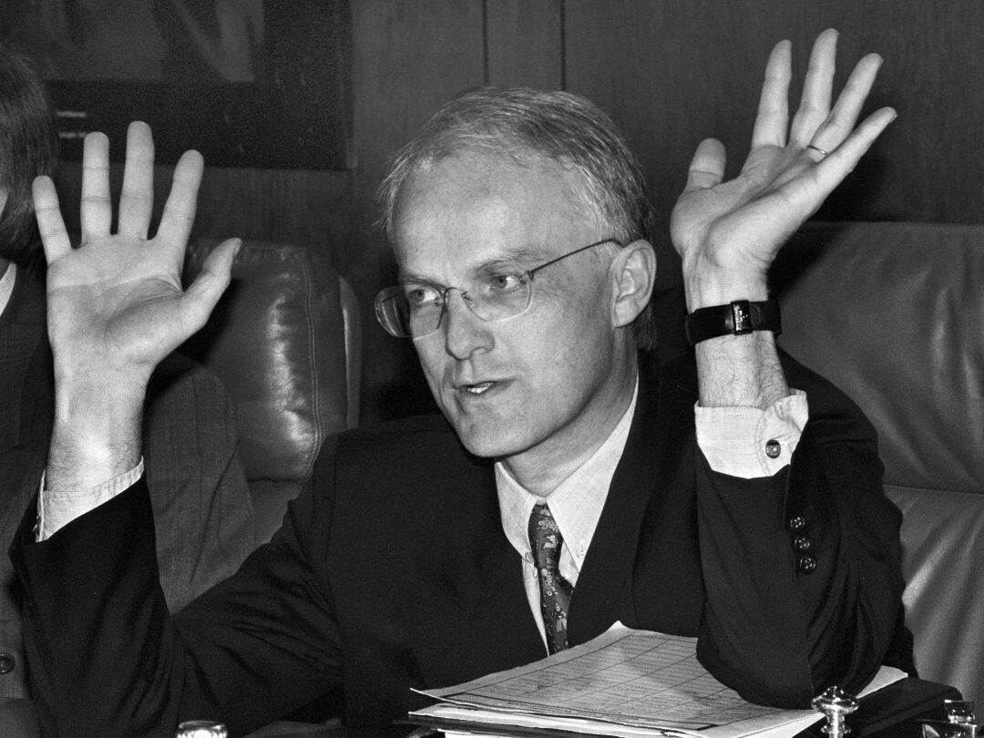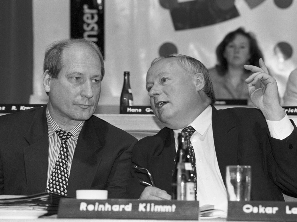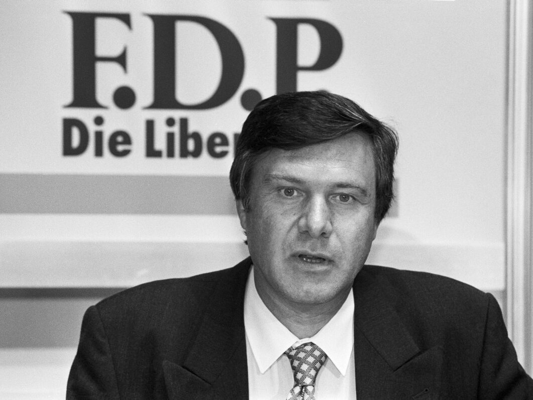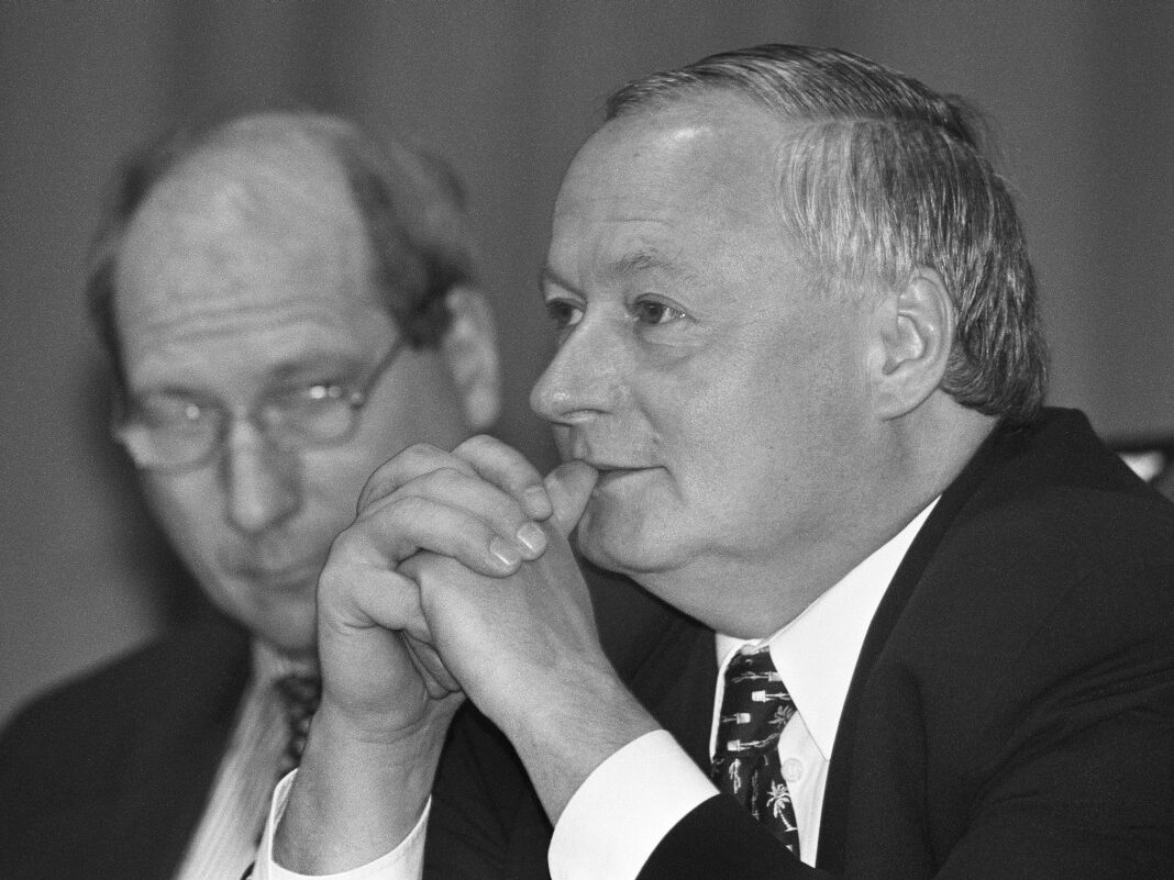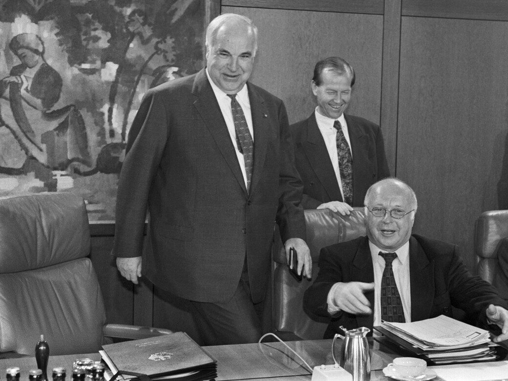 11.11.1989-Bonn Kabinettssitzung Foto: Otto Graf Lambsdorff im Gespräch mit Juergen Moellemann